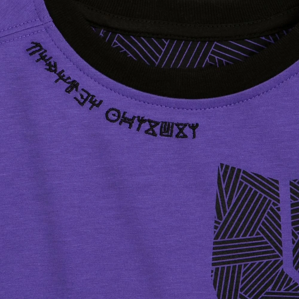 They will stand tall like their heroes in this Black Panther: Wakanda Forever t-shirt emblazoned with the iconic Black Panther symbol and embroidered with ”Wakanda Forever” written in the Wakandan alphabet. Black contrast trim and geometric details on the inside collar make this royal purple tee so very stylish. Just like your young hero.