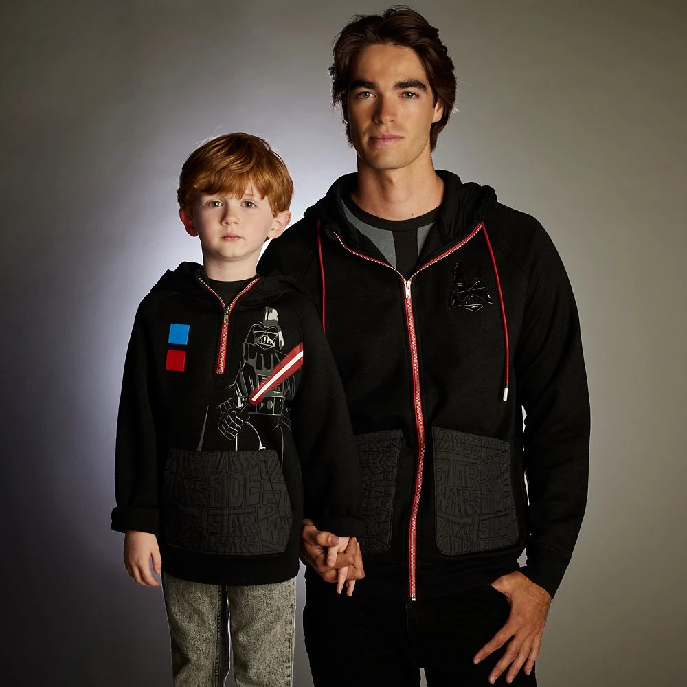 Ready for battle, this Darth Vader half zip fleece hoodie features striking puff print art of the Dark Master and a contrast zipper in his signature red. The phrases ”Star Wars,” the ”Dark Side”and ”Darth Vader”are quilted into the pouch pocket for added drama. It’s topped off with a hood that would make the Sith proud.