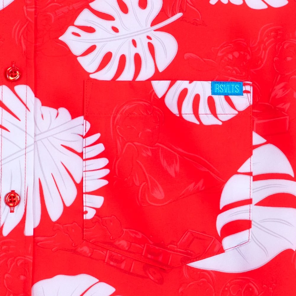 ”He Mele No Lilo” means ”A Song for Lilo” and this button down shirt by RSVLTS means cool comfort and effortless style for you. Inspired by Lilo’s signature red dress, it has an allover backdrop featuring images of Lilo and her bestie Stitch. Made from KUNUFLEX, with classic lines and four-way stretch, you’ll definitely be singing its praises every time you wear it.