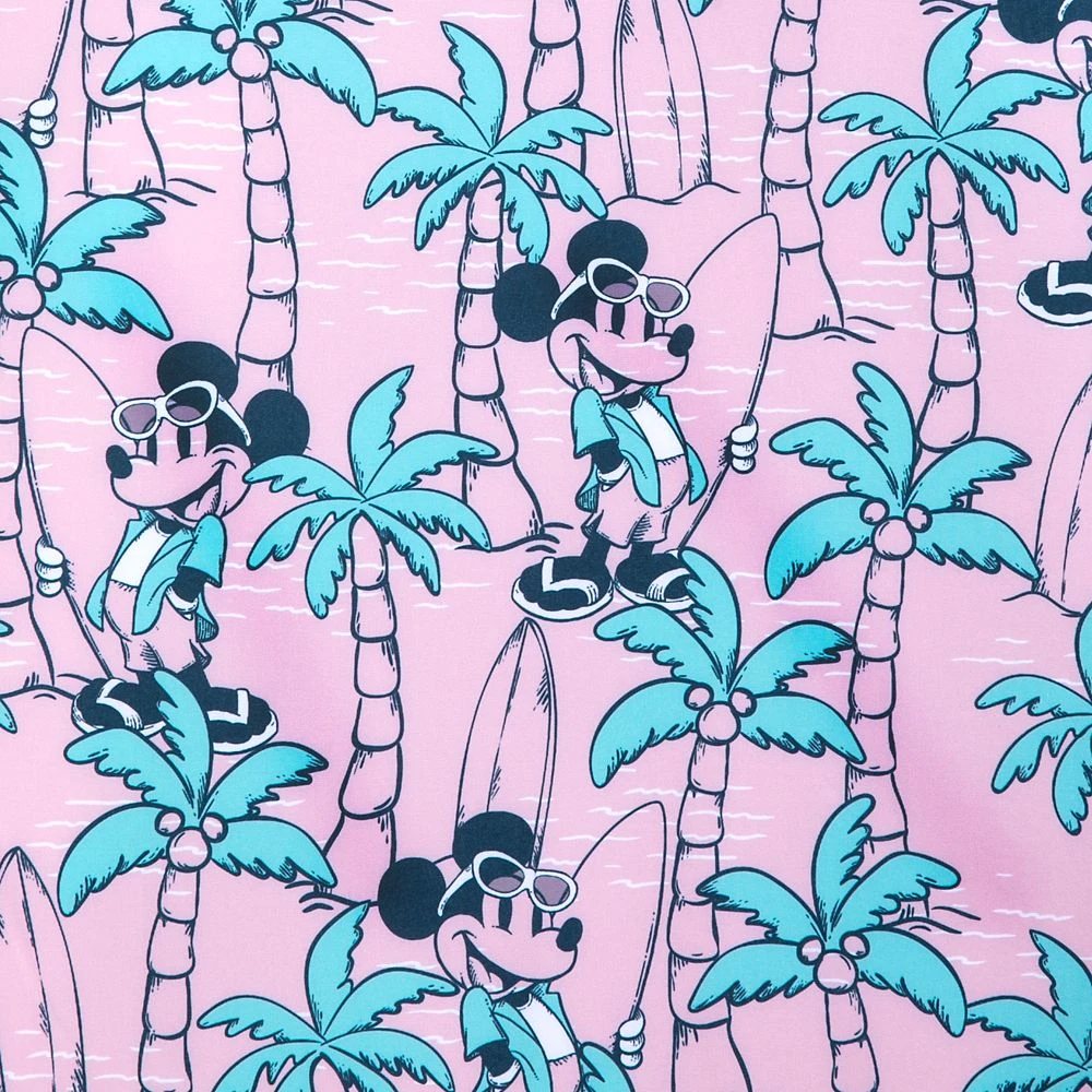 Join Mickey on vacation at the island paradise pictured in the allover print on these shorts by RSVLTS. Clutching his surfboard, Mickey is all set to hang ten as he poses beneath the tropical palm trees. Made of KUNUFLEX that’s designed to keep you cool, these hybrid shorts are perfect for land or water and have an elastic waistband with a decorative tie.