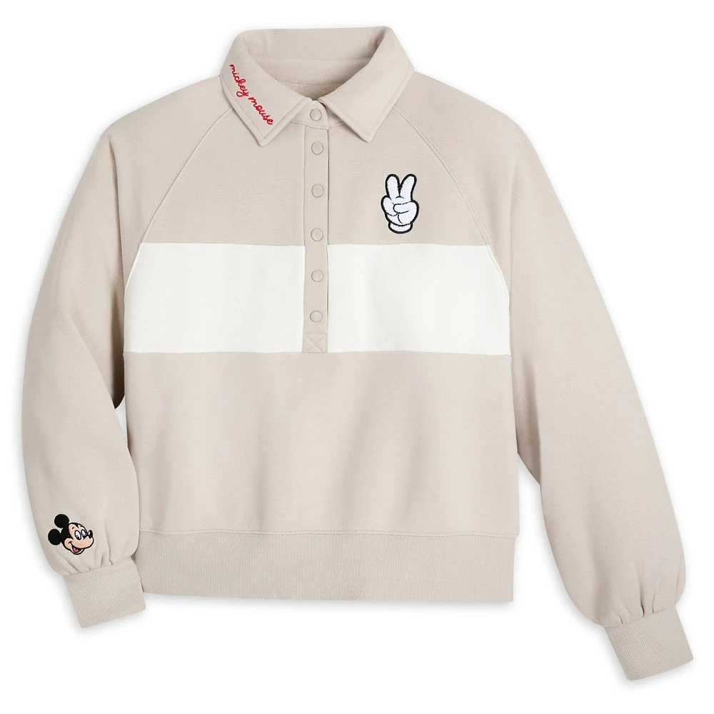 Mickey Mouse flashes his ”peace sign” glove on this raglan sleeve sweatshirt with collar. With its 3/4 snap front placket, pieced stripe, and embroidered Mickey portrait and ”signature,” it’s a wonderful way to keep warm and cozy around the seasons.