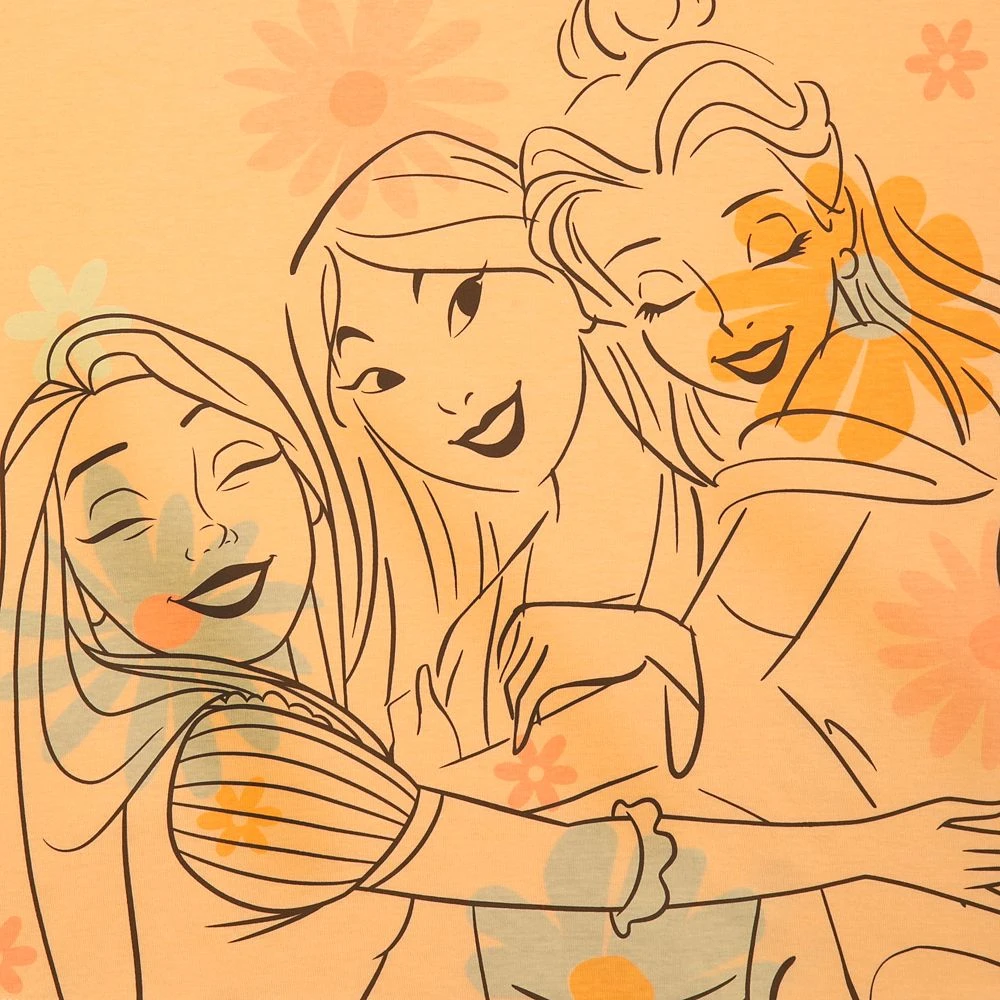 Girls just want to have fun, even if they are Disney Princesses. Belle, Rapunzel and Mulan share a group hug on the front of this fashion tee with allover pastel floral print, dropped shoulders and contrast ribbed collar.