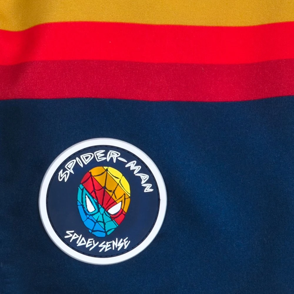 Heroic bands of bright color circle these Spider-Men swim trunks that will save the day when they’re heading to the beach or pool. The front features an appliqué of the legendary Marvel character’s iconic mask with a rainbow design across it and the equally iconic ”Spidey sense” slogan.
