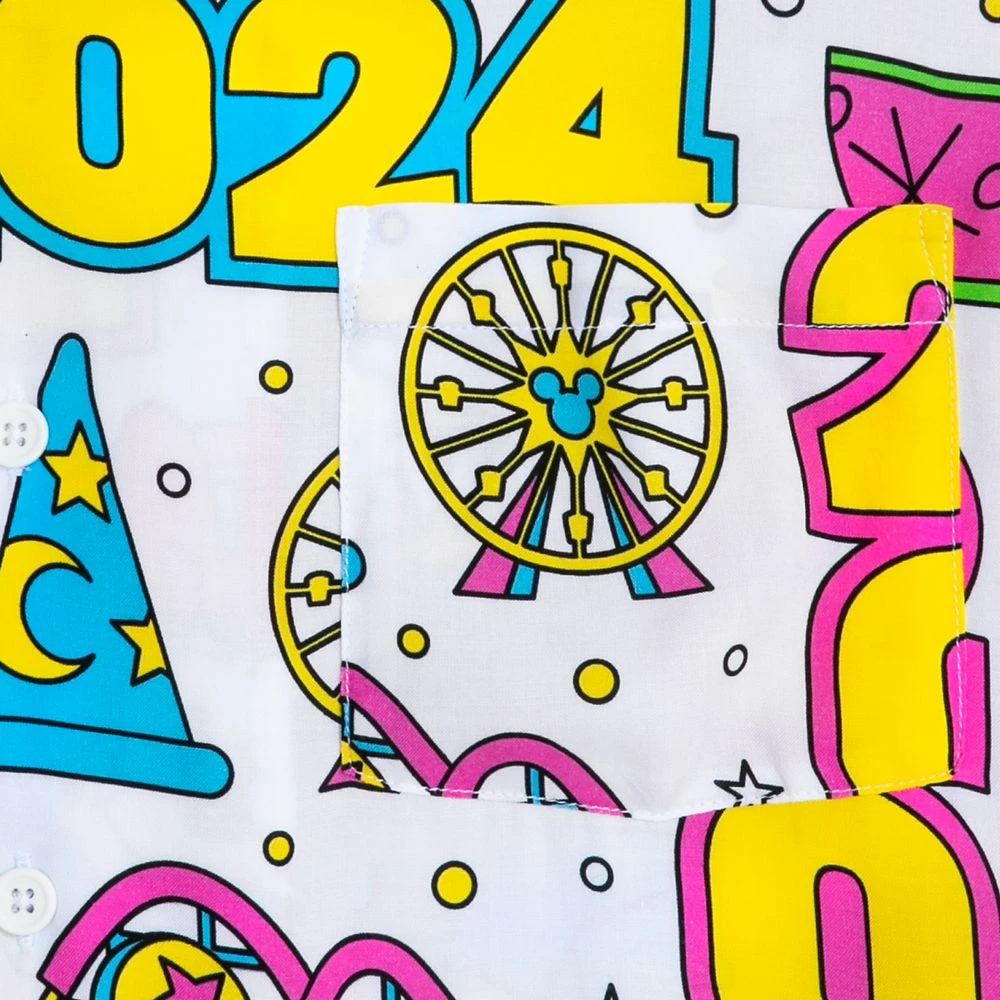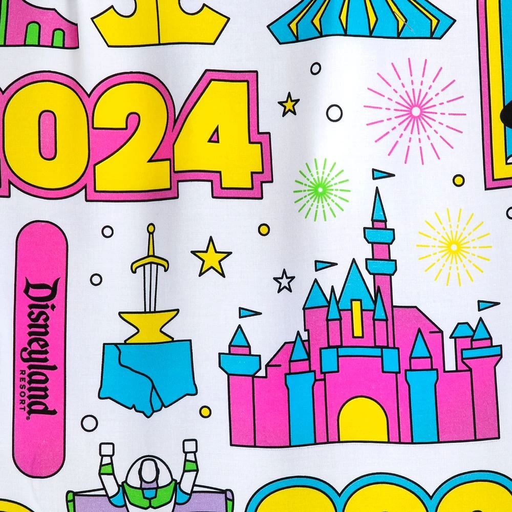 Mickey and Minnie Mouse have the happiest faces on Earth at The Happiest Place on Earth in 2024. This Disneyland woven shirt has an allover pattern with colorful neon artwork featuring popular characters, Parks icons, attractions and ”2024” to get you excited about next year’s trip!